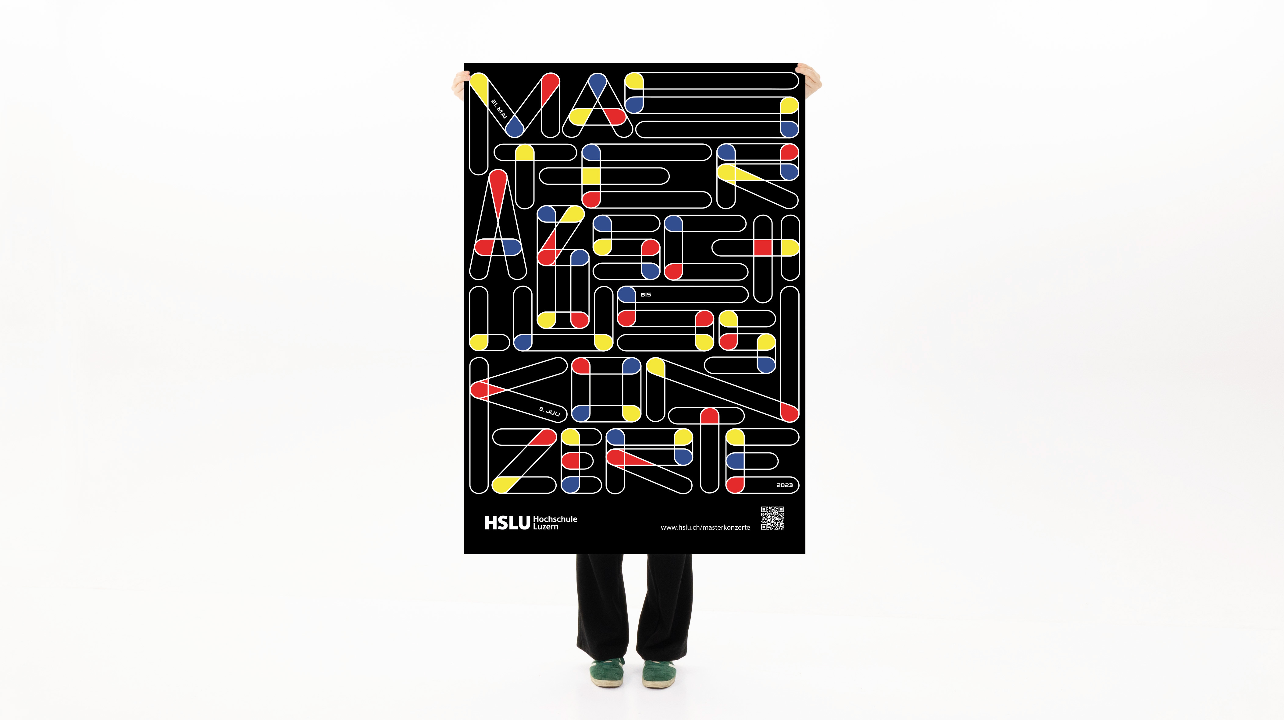 Im Auftrag der Musik Hochschule Luzern habe ich ein Plakat für die Masterabschlusskonzerte 2023 gestaltet. Laute, starke Töne. Feine, weiche Töne. Aus der freien Gestaltung sind verzerrte Buchstaben entstanden. Die einzelnen Buchstaben füllen die gesamte Fläche aus und fügen sich zu einem Musikstück zusammen. Die Farben widerspiegeln die Verspieltheit der Musik.