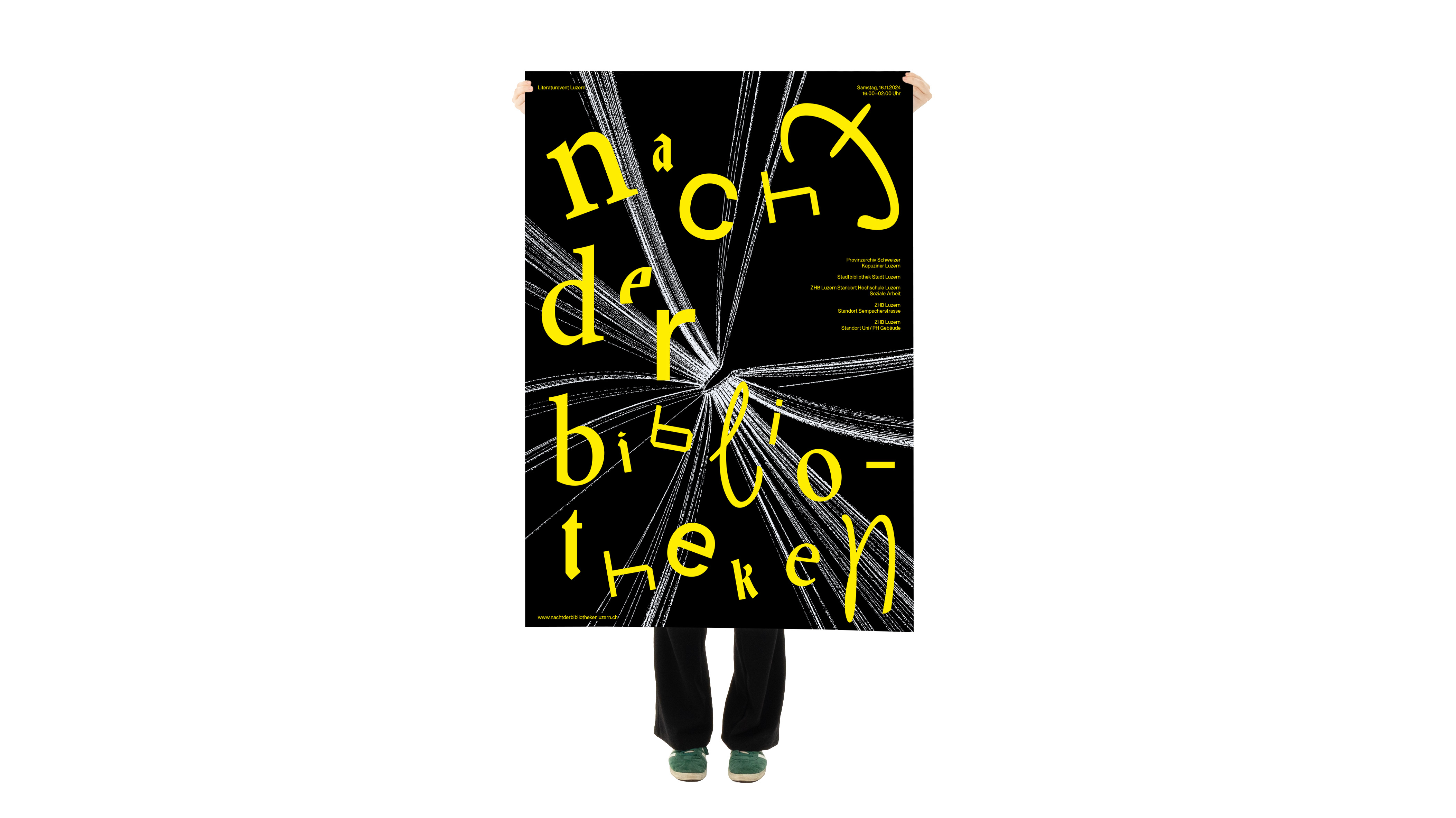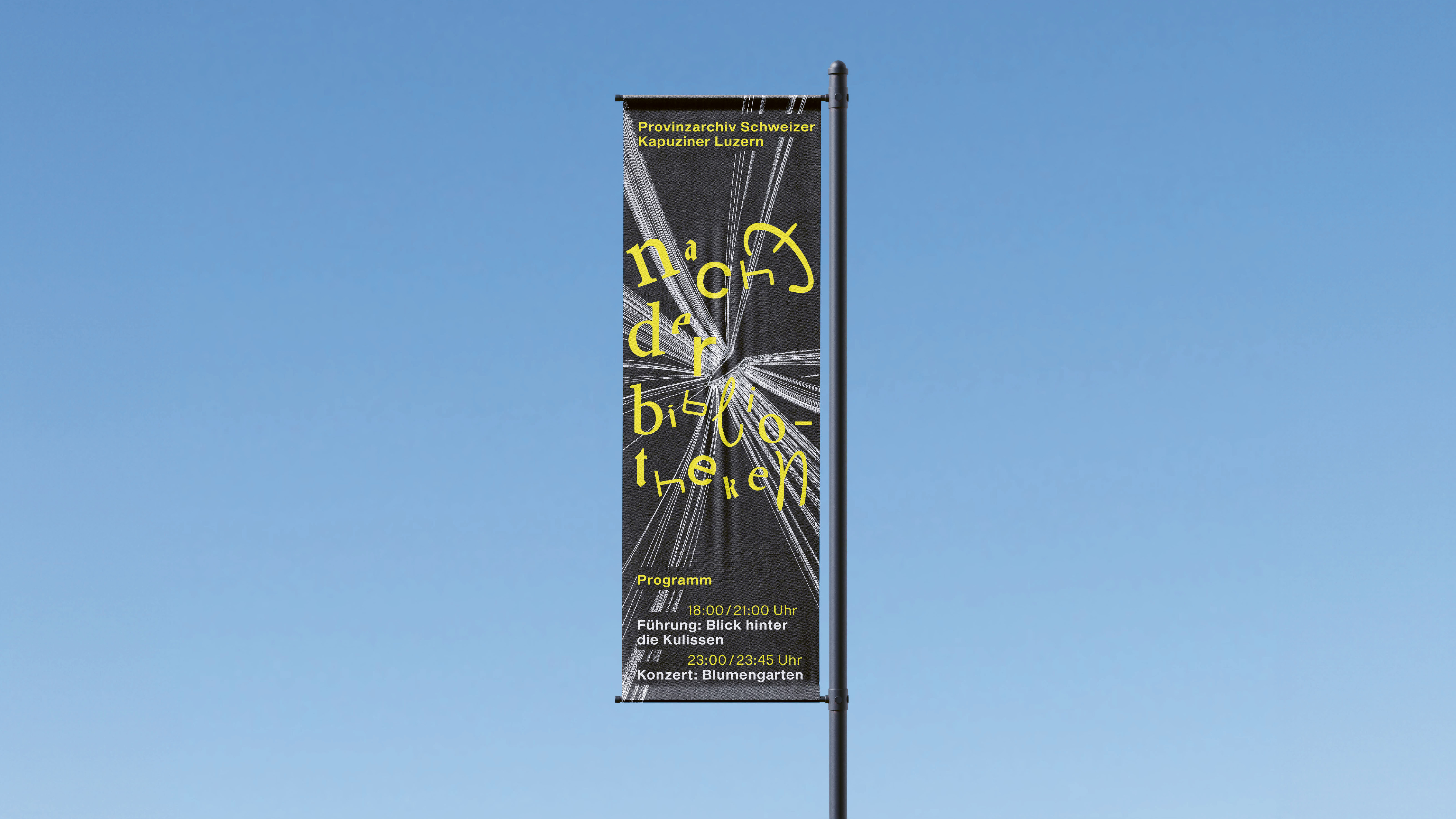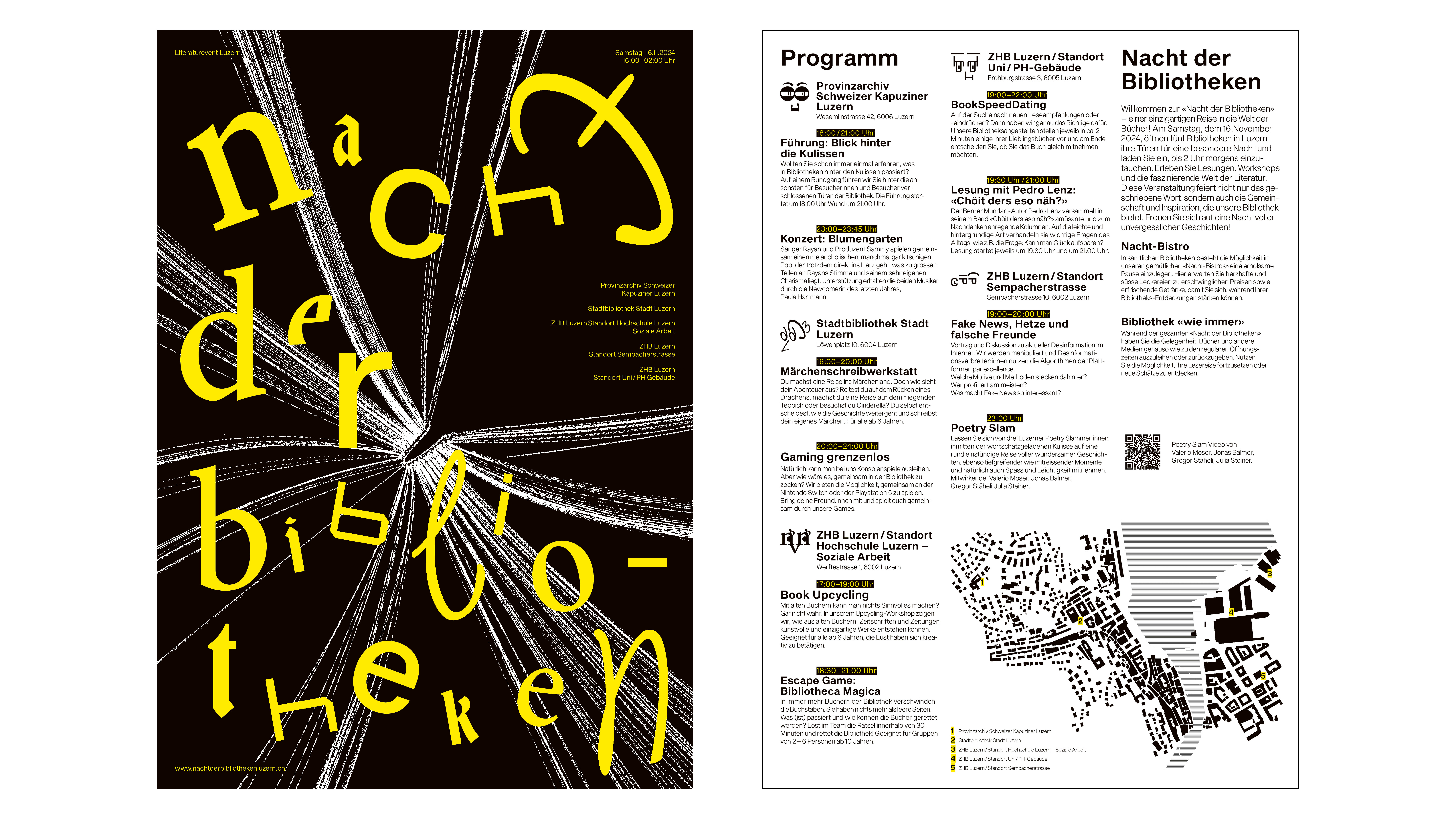 Beim Qualifikationsverfahren bestand meine Aufgabe darin, ein Corporate Design für die «Nacht der Bibliotheken» zu entwerfen. Dafür habe ich fünf individuelle Buchstabengesichter gestaltet, eines für jede in der Aufgabenstellung aufgeführte Bibliothek. Um die passenden Schriften auszuwählen, besuchte ich die jeweiligen Bibliotheken und suchte Schriftarten, die deren Charakter widerspiegeln. Mein Ziel war es, eine spielerische und vielfältige Gestaltung zu schaffen. Auf Basis der ausgewählten Schriften, gestaltete ich ein Plakat sowie dazu passende Fahnen, ein Programm mit Lageplan und eine Webseite.